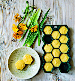 Die Ringelblumenblütenblätter in dem kochenden Wasser 15 Minuten ziehen lassen. Aloe-Vera-Gel, Honig und Ringelblumen-Aufguss (mit Blütenblättern) vermischen, bis eine glatte Paste entsteht. Dann das ätherische Lavendelöl unterrühren. In Eiswürfelförmchen füllen und in die Gefriertruhe stellen. Sobald die Würfel gefroren sind, in einem luftdichten Gefäß in der Gefriertruhe aufbewahren.