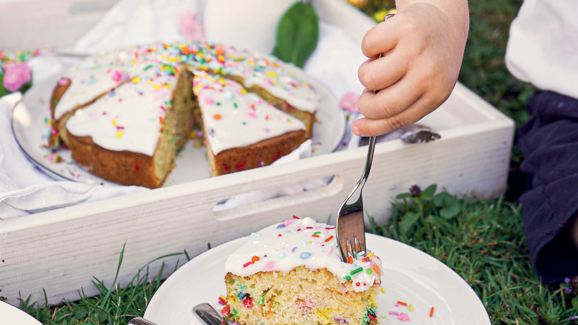 3. Die Backform ausfetten und den Teig hineinfüllen. Die Form in den Ofen stellen und ca. 30 Minuten backen. Garprobe machen. Den Kuchen dann in der Form abkühlen lassen, stürzen und, wenn gewünscht, noch mit dem Zuckerguss aus Puderzucker und Zitronensaft übergießen und noch mehr bunte Zuckerstreusel darauf verteilen.