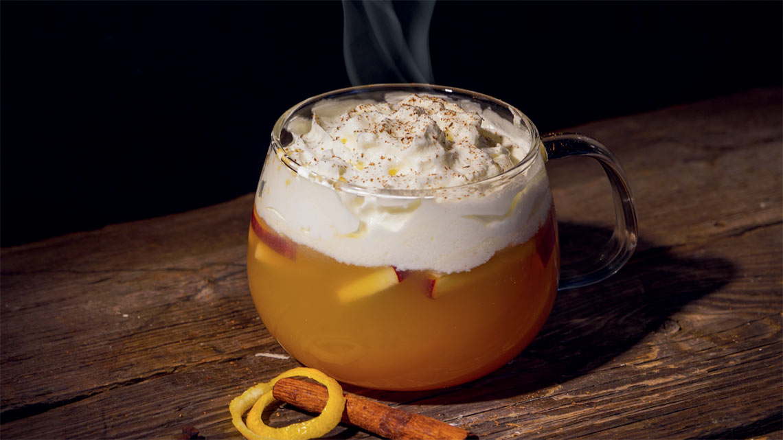 - Die Sahne mit dem Zimt und dem Bourbon-Vanillezucker mit einem Handrührgerät steif schlagen. Die gebackenen Apfelscheiben auf 4 hitzebeständige Gläser oder Tassen verteilen. Den Punsch durch ein feines Sieb darübergießen. Die Sahne daraufgeben. Mit Zimtpulver bestäuben.