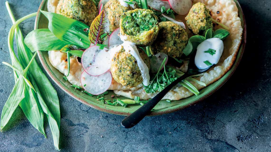 Bärlauch gehört zu den beliebtesten Wildkräutersorten. In diesem Rezept gibt er den Falafeln eine ganz besondere Note.