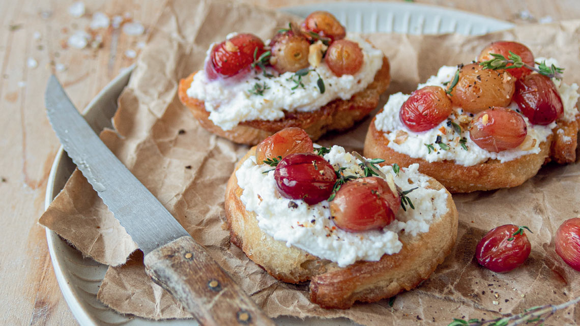 In Olivenöl geschwenktes, geröstetes Baguette trifft hier auf saftige, reife Weintrauben und den puren Charme von Ricotta. Besser kann unser Weihnachtsabend kaum starten.