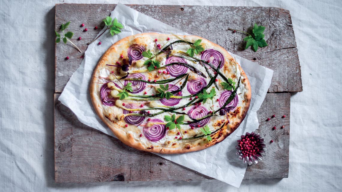 Für den Belag den Bärlauch waschen, putzen und trocken tupfen. Die Zwiebeln schälen und in feine Ringe schneiden. Den Teig in zwei Portionen teilen und auf einer bemehlten Arbeitsfläche mit den Handballen jeweils zu ovalen Fladen (ca. 30 cm) auseinanderdrücken. Die Teigfladen auf die vorbereiteten Bleche legen.