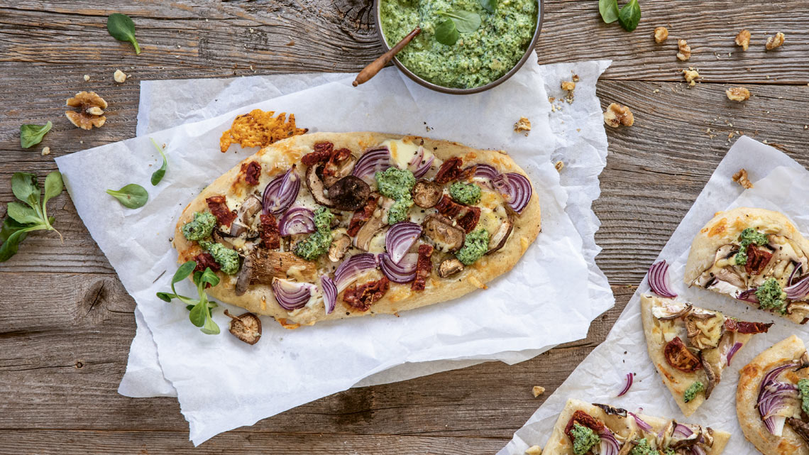 Rezept für Flammkuchen mit Pilzen und Feldsalat-Ziegenkäse-Pesto