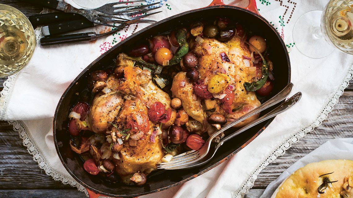 - Nun den Topf auf die untere Schiene im Backofen stellen und weitere 30 Minuten schmoren, bis das Geflügel völlig durchgegart ist. Zum Schluss noch pfeffern.