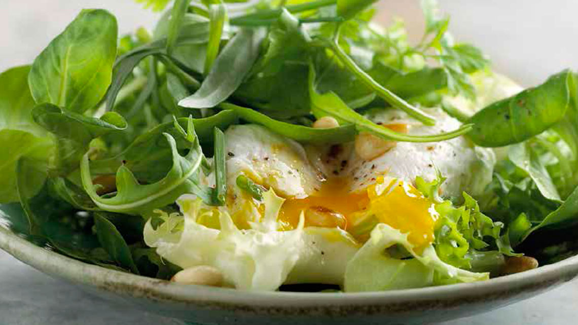 4) Den Salat, die Kräuter, die Pinienkerne und die Vinaigrette vermengen und auf Tellern anrichten. Die abgetropften Eier auf die Salatportionen setzen und mit frisch gemahlenem Pfeffer bestreuen.