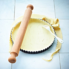 Den Ofen auf 180 °C vorheizen. Den Mürbteig zwischen Backpapier ausrollen und mit diesem in die Form heben. Den Teig mit einer Gabel einstechen, dann 10 Minuten backen.