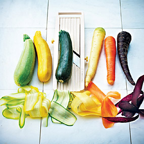 Die Karotten schälen, die Zucchini waschen. Das Gemüse mit einem Sparschäler oder einem Gemüsehobel in feine Streifen schneiden.