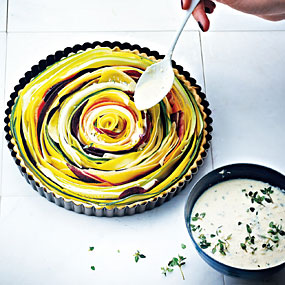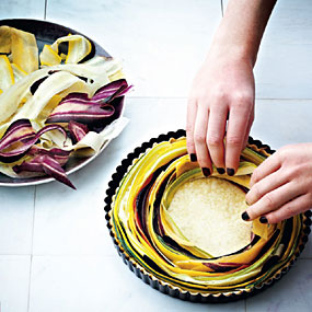 Die Gemüsestreifen spiralförmig auf den vorgebackenen Teig drapieren.