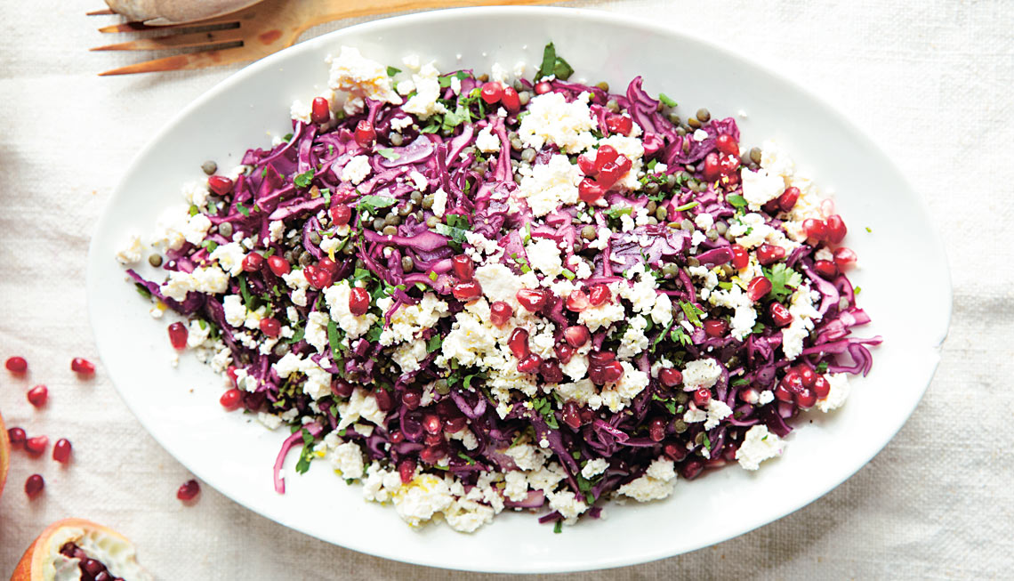 - In einer Servierschale die Linsen mit dem Rotkohl mischen. Die Granatapfelkerne, den Feta und den Koriander darauf verteilen. Falls nötig, noch einmal nachwürzen.