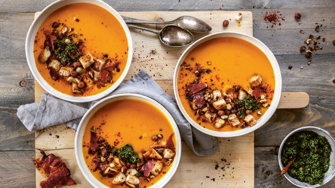 - Die Suppe mit Croûtons, Schinken und Haselnüssen bestreuen und mit jeweils 1 TL Kürbiskernöl auf Tellern anrichten.