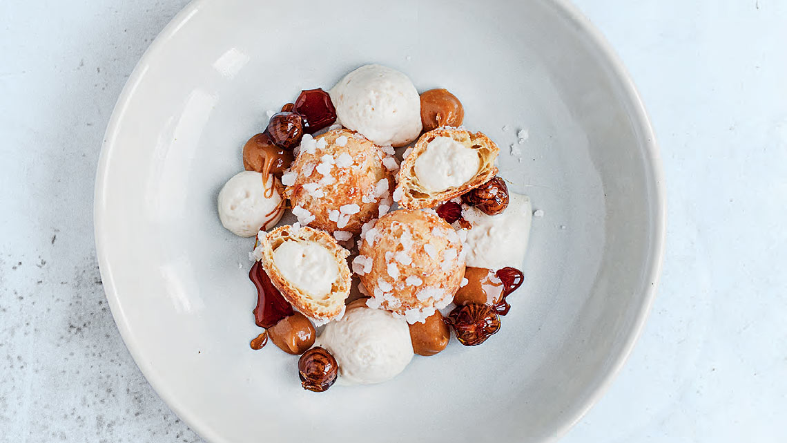 Anrichten: Jeweils 3 Windbeutel auf einen Teller setzen. Einen Windbeutel durchschneiden. Einige Häufchen Karamellsahne mit den karamellisierten Haselnüssen um den Rand verteilen und mit dickfl üssigem Karamell garnieren.