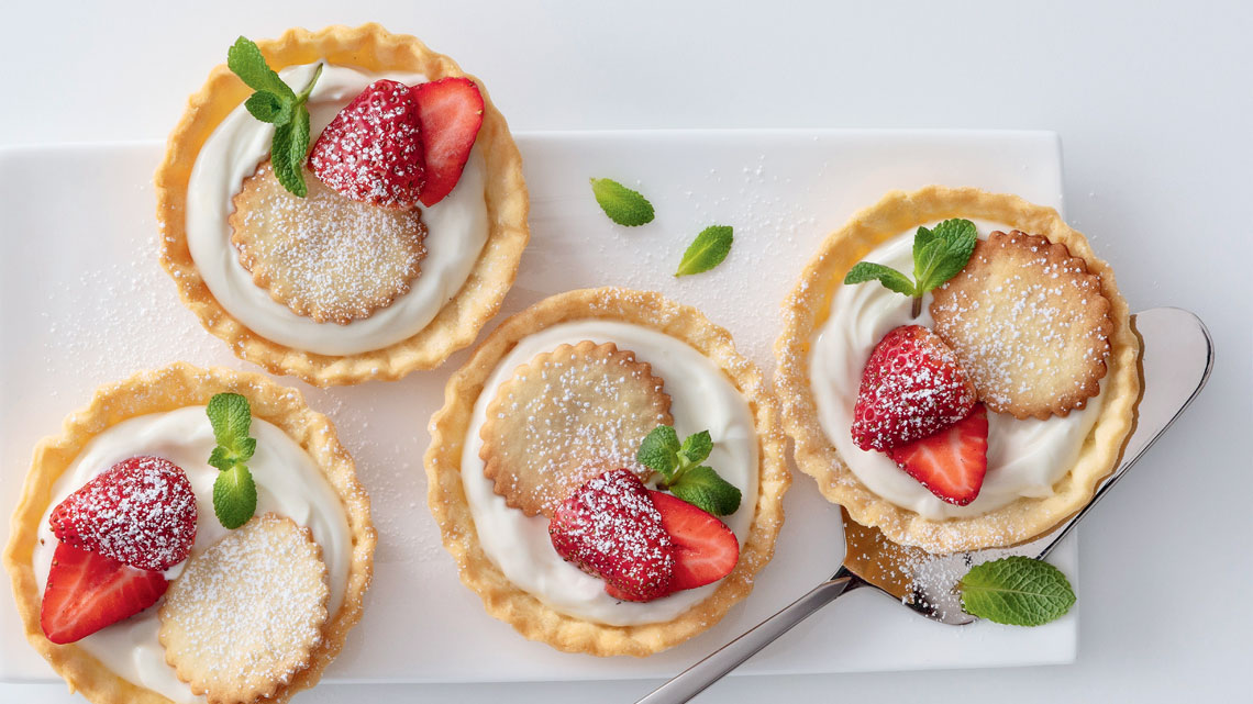 4. Die Erdbeeren abbrausen, putzen, trockentupfen und halbieren. Für die Creme den Joghurt mit dem Lemon Curd glattrühren. In die Törtchen füllen und mit den Erdbeeren und ggf. den Keksen belegen. Mit Puderzucker bestäuben und, falls gewünscht, mit Minze garnieren.