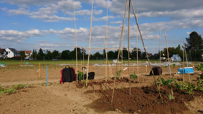 Durch die Corona-Krise verzögerte sich der Starttermin um ein paar Wochen, aber seit Mitte Mai haben alle Kolleginnen und Kollegen ihre 40 qm Ackerfläche in Angriff genommen. Da wurden schon fleißig Setzlinge eingepflanzt, Tomaten und Paprika gesetzt, kleine Tipis für Bohnen und rankende Gemüsesorten aufgebaut, Erde gehackt und umgegraben, gegossen und gehegt, was schon vom Bauern vorgepflanzt war.