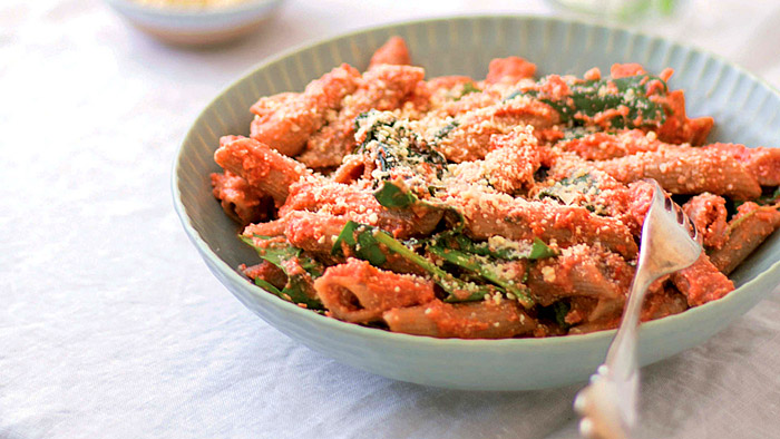 Ein kleines Stück Italien für Zuhause. Lynn Hoefers Lieblingspasta mit einer ungewöhnlich leckeren Tomatensoße. Himmlisch gesund, rein pflanzlich und absolut unkompliziert!