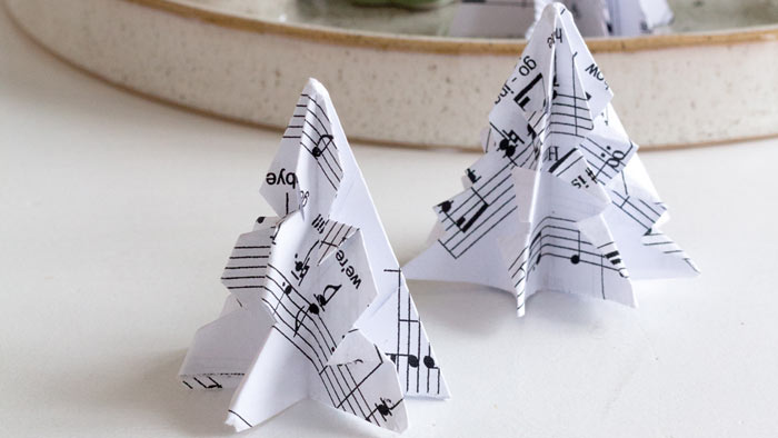 Aus alten Noten oder auch anderem Papierresten lassen sich diese wundervollen kleinen Weihnachtsbäumchen für die festliche Tafel schnell und einfach selber machen