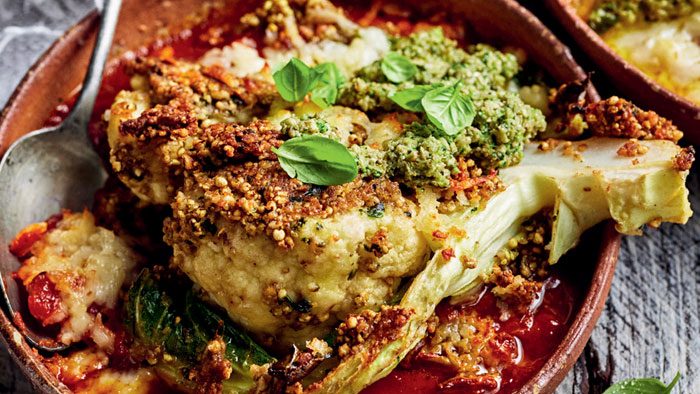 Dieser wunderbare Gemüseauflauf mit Blumenkohl und Käse schmeckt an kalten Tagen besonders gut, denn frisch aus dem Ofen wärmt er nicht nur den Körper, sondern auch die Seele. Das raffinierte Topping aus Hirse und Broccolipesto verleiht dem Gericht zusätzlich das gewisse Etwas.